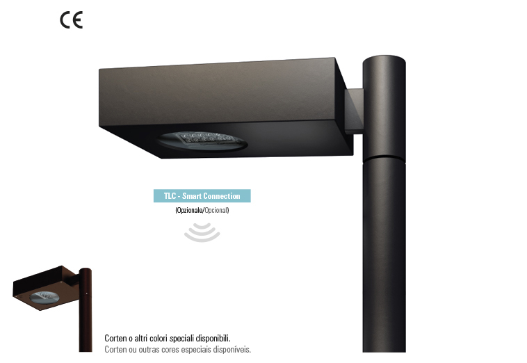 Apparecchio d’illuminazione stradale e arredo urbano a LED di ultimissima generazione (design R&D Litek), struttura superiore in acciaio INOX AISI304 e verniciatura in poliestere a polvere a lunga durata per esterni di colore “Antracite” RAL 7016 goffrato, struttura inferiore in alluminio. Specificatamente progettato per la tecnologia LED, con gruppo ottico sigillato con schermo protettivo in vetro temperato da 4 mm extra chiaro (escluso vers. 3D), compatto e ad alte prestazioni, tonalità luce standard neutra (4000 K), calda (3000 K), molto calda (2700 K) o caldissima (2200 K); ottiche stradali, roto-simmetriche e diffondenti con emissione totalmente cut-off (escluso vers. 3D). Nuovi MULTICHIP LED a base ceramica per rifusione diretta, LED elettricamente isolati dal sistema termico di dissipazione, sistema di pilotaggio LED in corrente costante Vdc, diverse tipologie di funzionamento/accensione (RO, OF, DMP, DM, TLC, DA, CLO); sistema LITEK di dissipazione calore TCS (Thermal Cooling System) ridondante con controllo automatico di sicurezza della temperatura, alimentazione 110/240Volt 50/60 Hz e cos-fi ≥0,9, classe di isolamento I o II, grado di protezione IP66 min., protezione agli urti IK08, bulloneria in acciaio inox o nylon. Marcatura CE.